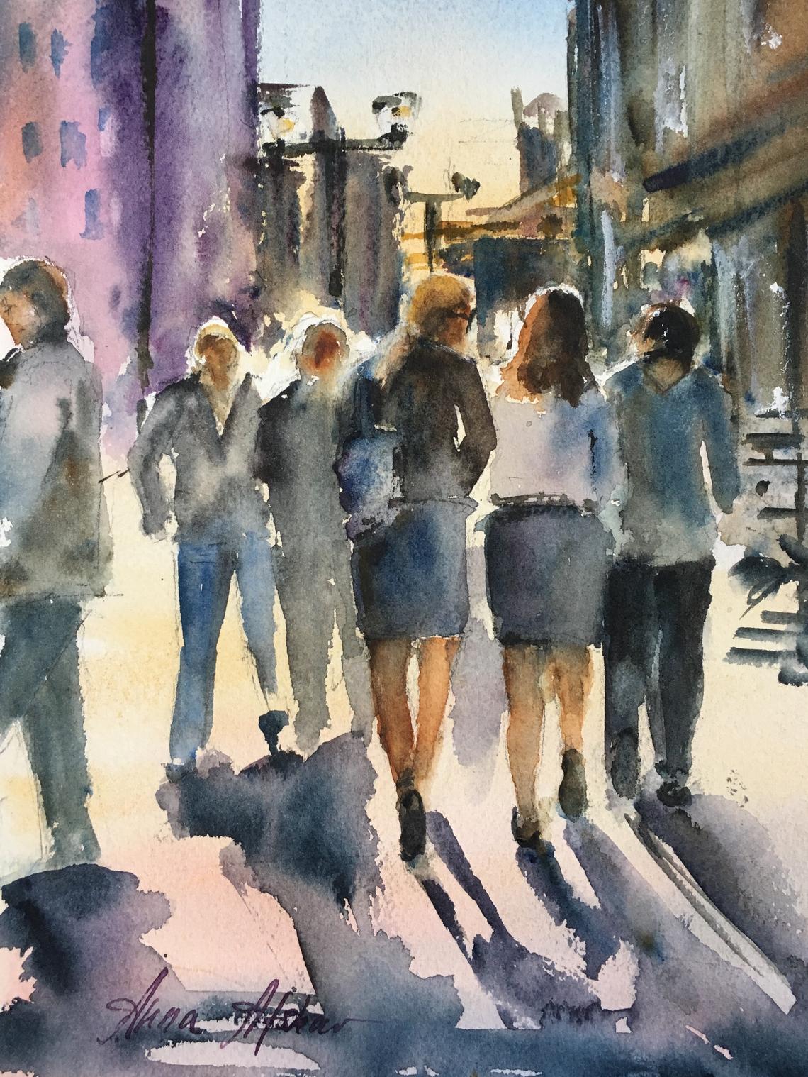 "Monument Circle Lights, Red Umbrella series" watercolor/acrylic on canvas, 24x30, SOLD